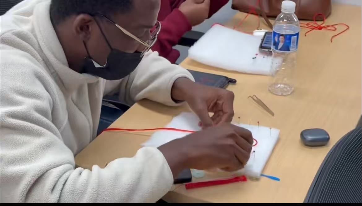 活动伊始,汉语国际教育专业的学生作为文化讲解员,向来华留学生们介绍了中国结的文化内涵。从中国结的历史渊源出发,详细讲解了其在不同朝代的发展演变,以及“同心结”“吉祥结”等不同款式所承载的团圆、祈福等美好寓意,让留学生们对这一传统手工艺有了初步的文化认知。