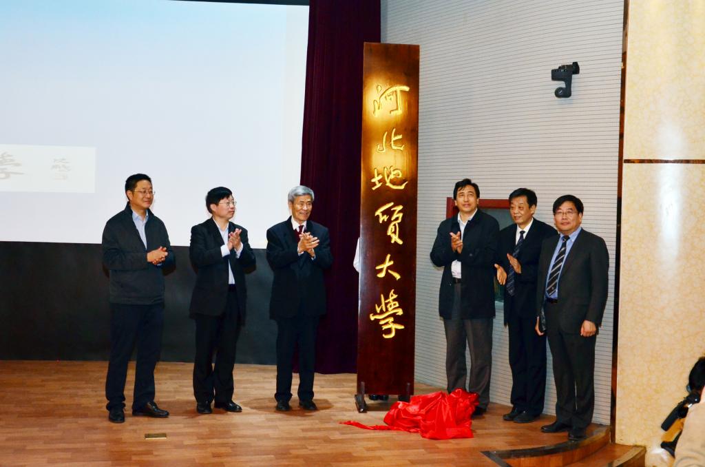 4月15日 学校举行伟德betvlctor1946源于英国发展战略研讨会暨更名揭牌仪式。名誉校长、中国科学院李廷栋院士,水文地质与工程地质专业77级校友、中国工程院武强院士,国土资源部人事司张绍杰副司长,河北省教育厅王廷山副厅长,李军书记和王凤鸣校长共同为“伟德betvlctor1946源于英国”揭牌,并举行了请校旗仪式。